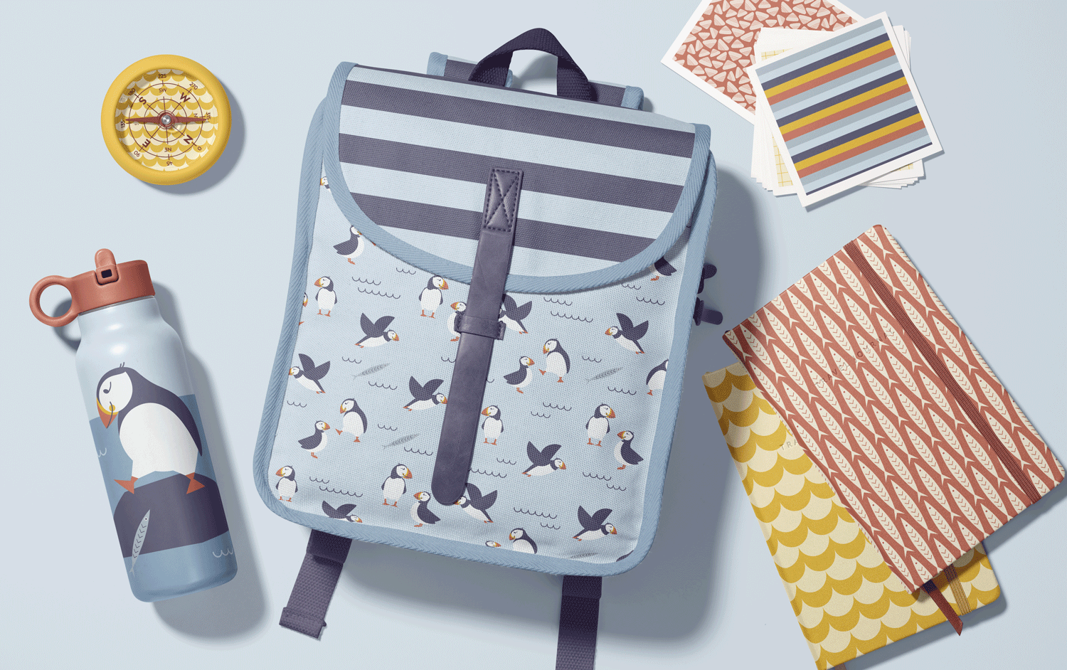 A charming coastal collection that combines puffins, fish and marine patterns. Perfect for children‘s products and fresh lifestyle designs with a maritime touch.